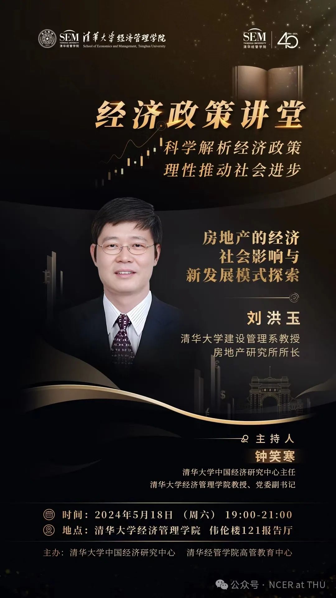 5月18日,清华大学建设管理系教授、房地产研究所所长刘洪玉老师,将做客《经济政策讲堂》,与全校师生、校友共同探讨该话题。